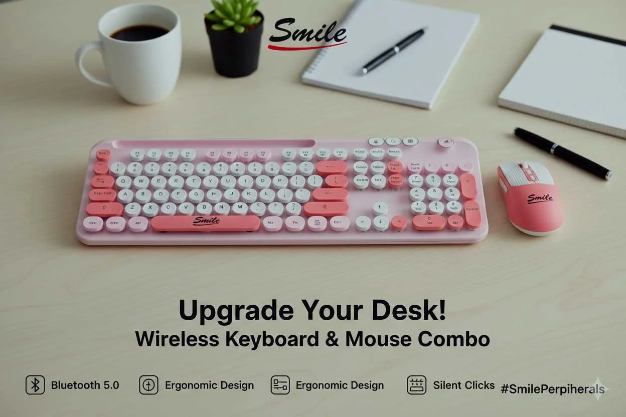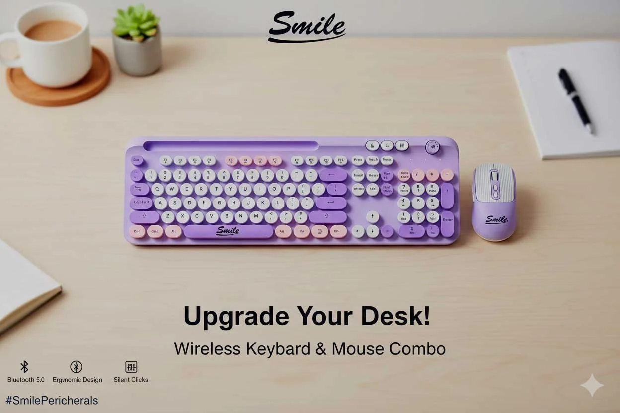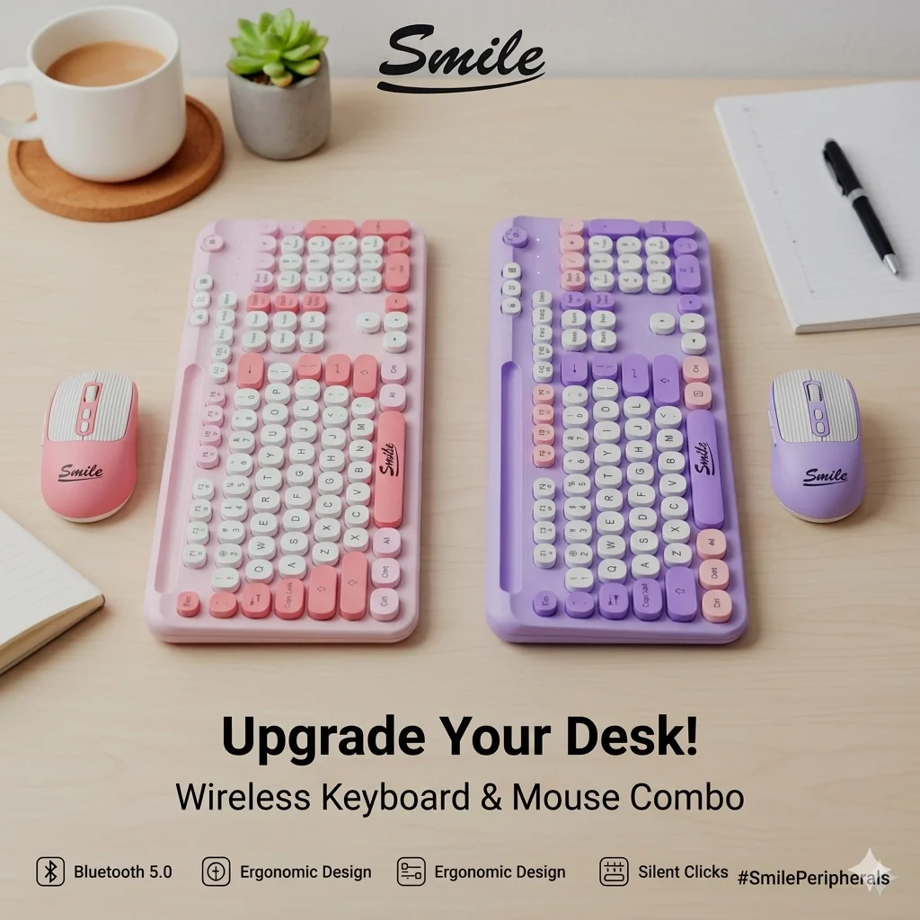 كيبورد وماوس Smile CR002 الحل الأمثل لتجديد مظهر مكتبك وزيادة إنتاجيتك، حيث تجمع بين التصميم الكلاسيكي للأزرار الدائرية وتقنية الاتصال اللاسلكي المتطورة، مما يوفر لك حرية الحركة ونظافة المكتب من الأسلاك.