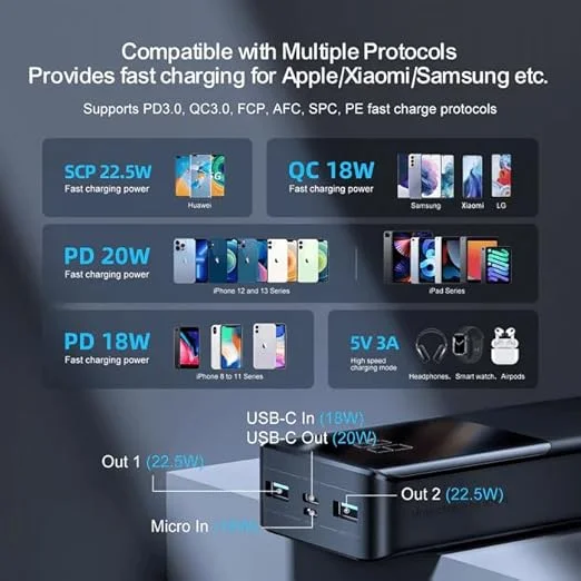 - سعة هائلة تملأ يومك: بقوة 20,000 مللي أمبير، يمكنك شحن هاتفك الذكي عدة مرات (حوالي 4-5 شحنات لمعظم الهواتف) دون الحاجة لإعادة شحن الباور بنك نفسه.