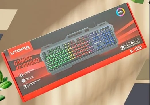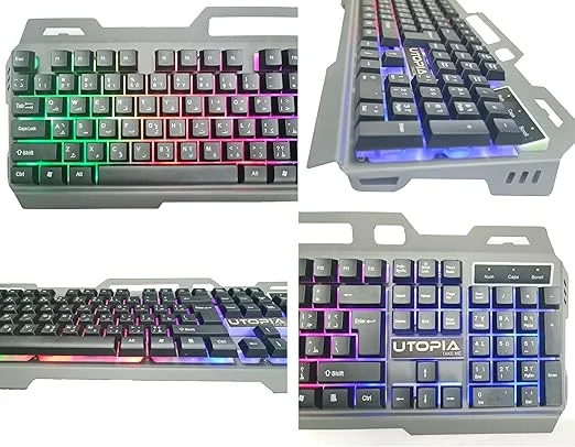 كيبورد يوتوبيا K-102 بتوصيل يو إس بي مع إضاءة خلفية و غطاء معدني، لون أسود متوافق مع الكمبيوتر يدعم العربية والإنجليزية