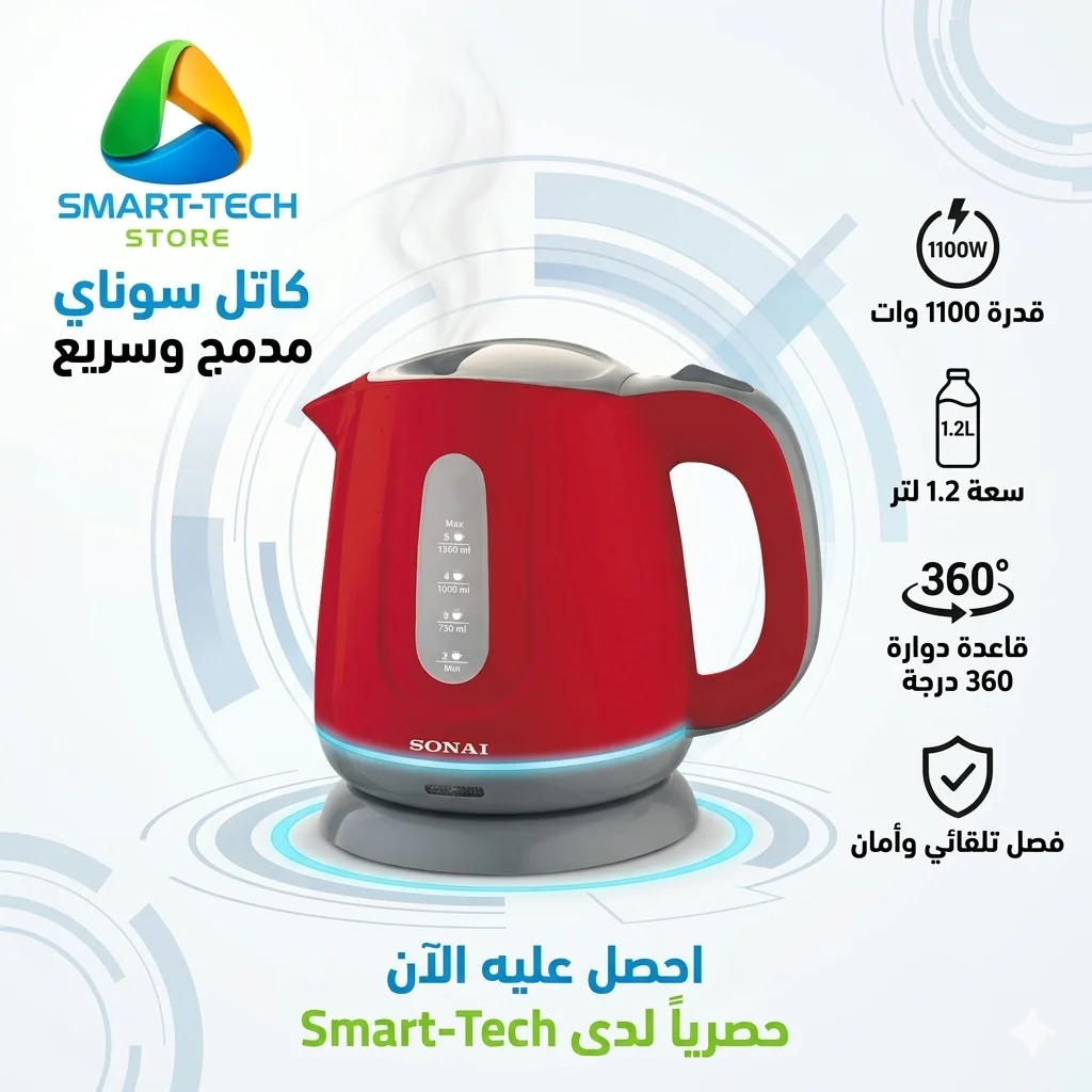 💡 نصيحة Smart-Tech: تتميز غلاية سوناي بجسم خارجي متين وسهل التنظيف، وهي رفيقك الدائم لتحضير كوب الشاي أو القهوة المثالي في دقائق معدودة.