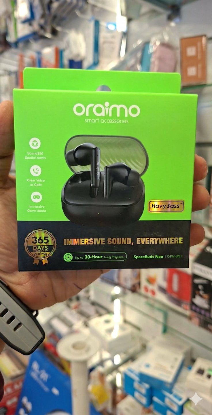 ايربودز اورايمو - سبيس بودز نيو OTW‑323 ، بلوتوث V5.4 وقت تشغيل 30 ساعة وصوت محيطي، مكالمات واضحة بتقنيةالعزل وضع لعب منخفض الاستجابة ومقاومة للماء IPX4، أسود