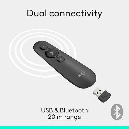ريموت جهاز عرض ليزر R500s مع اتصال مزدوج عن طريق البلوتوث أو USB من لوجيتيك، لعروض الباور بوينت والكي نوت وجوجل سلايدز، لاسلكي جرافيت , احمر