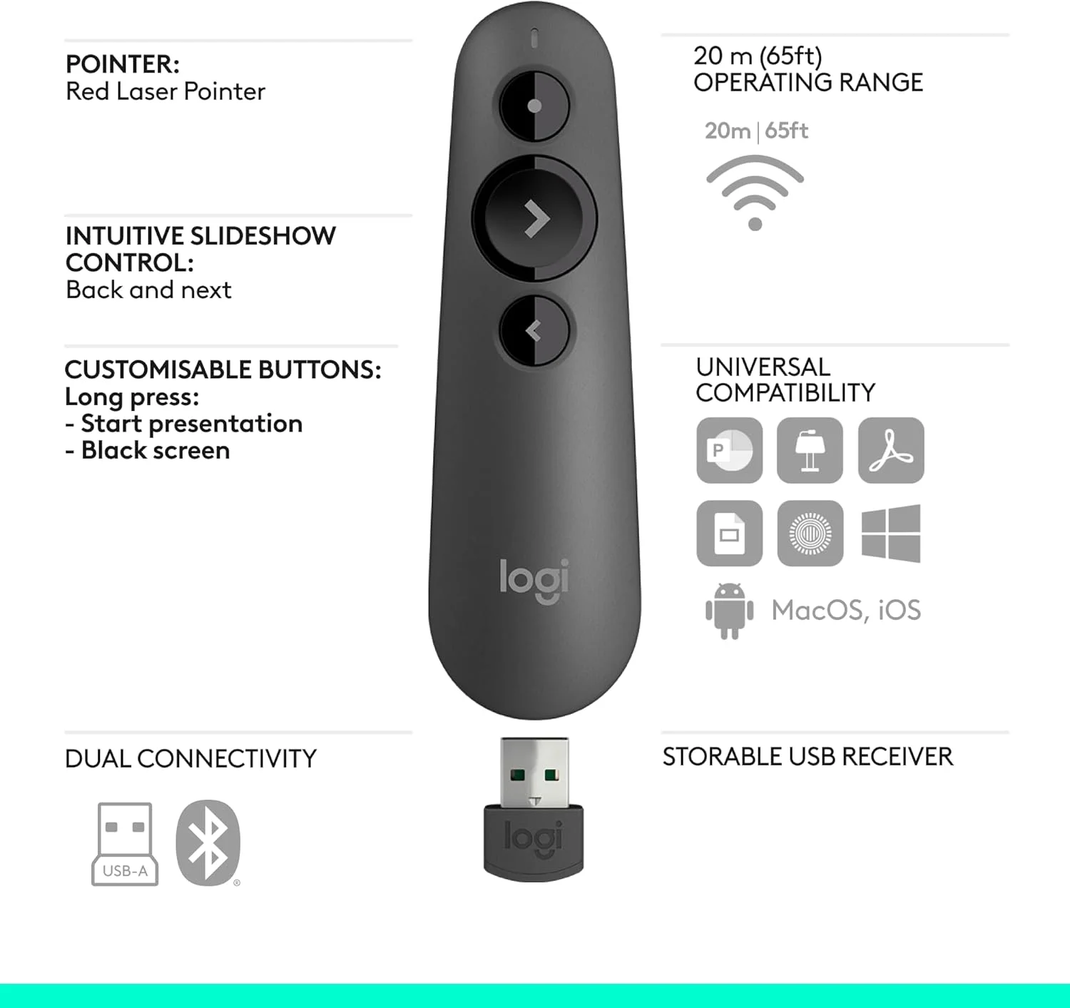 Deliver impactful presentations with the R500 Laser Presentation Remote. Move freely and navigate slides from up to 65 feet (20 meters) away – and point out precise areas of focus with the red laser pointer. The R500 is optimized to work with Windows®, macOS® and leading presentation software.