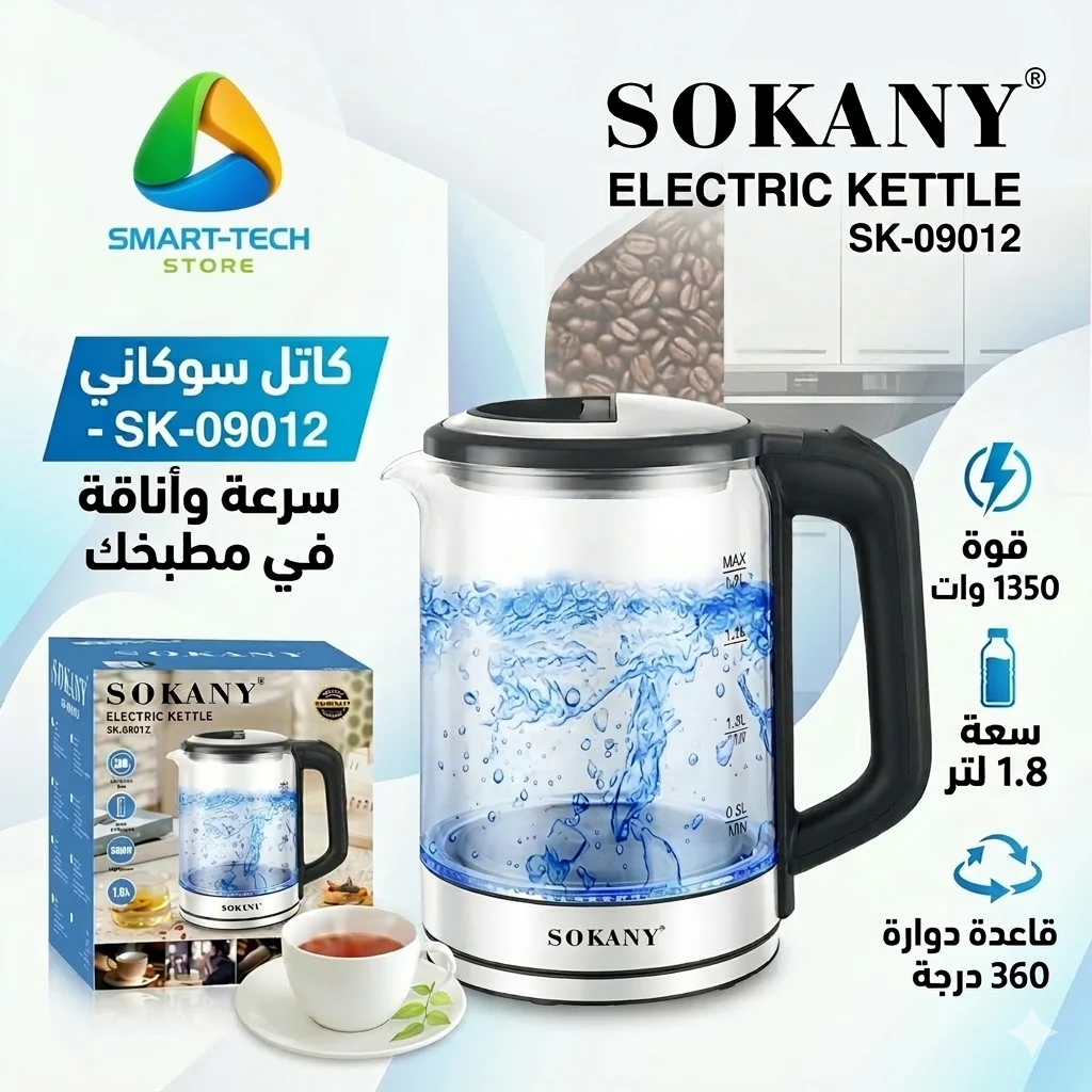 ☕ غلاية سوكاني الزجاجية SK-09012 – لمسة من الأناقة والسرعة في مطبخك من "سمارتك"!