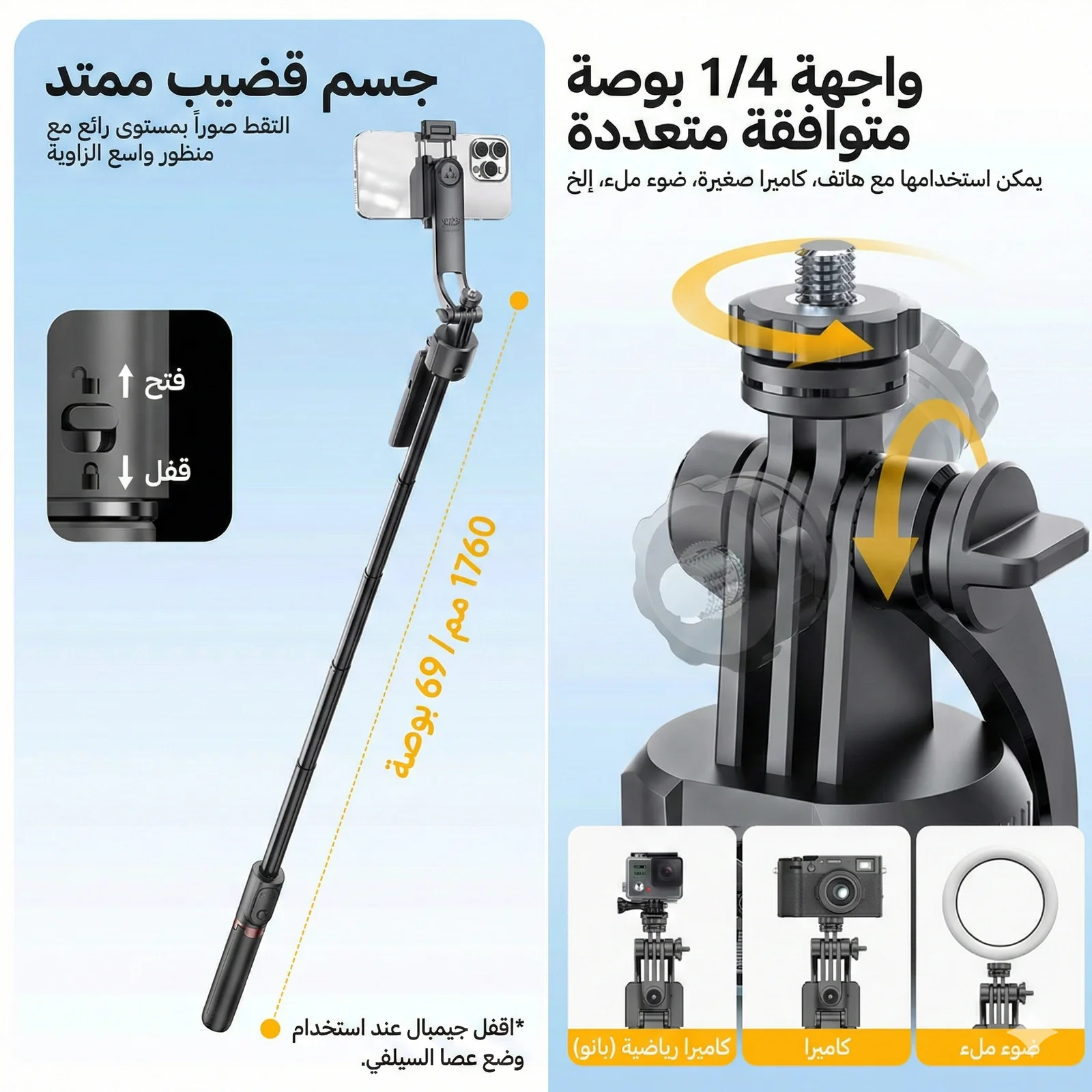 📏 قابل للتمديد حتى 1.76 متر (69 إنش)