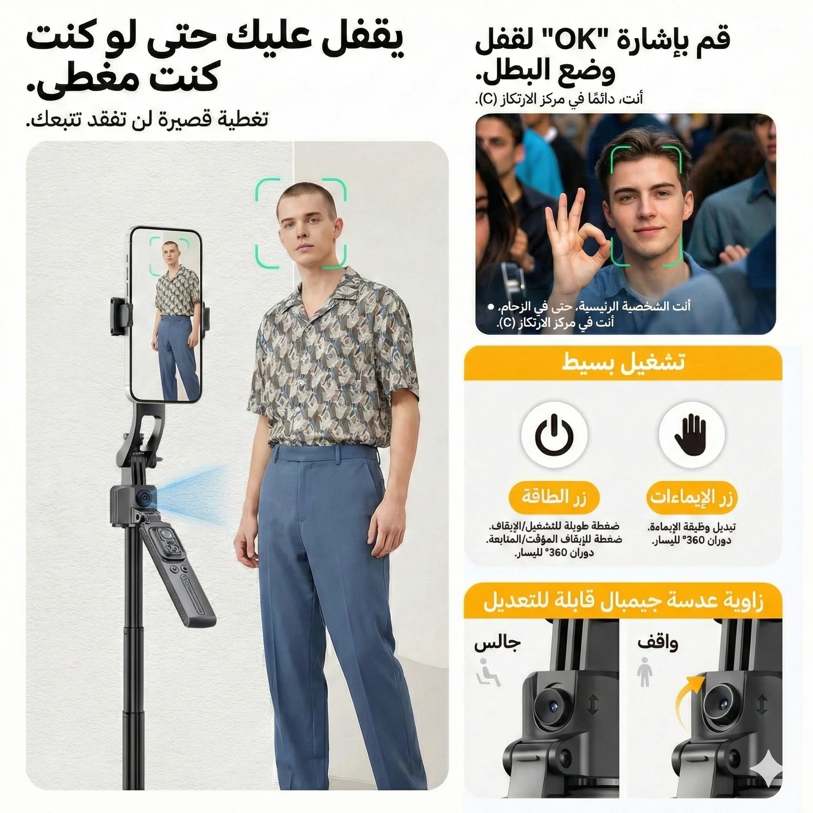 سواء كنت جالس أو واقف أو تتحرك — التصوير يظل ثابت واحترافي.