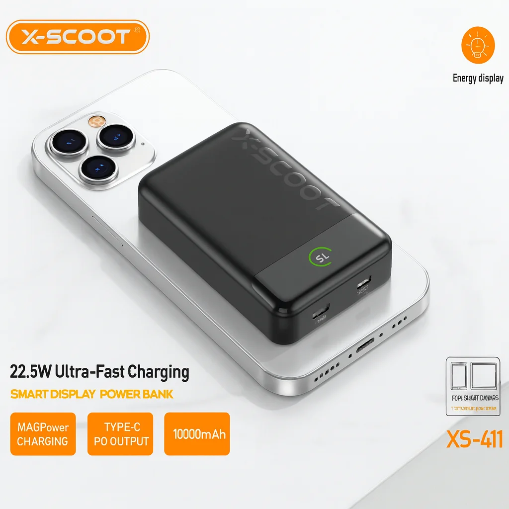 استمتع بحرية الحركة المطلقة مع باور بنك X-Scoot موديل XS-411. صُمم هذا الجهاز خصيصاً لمستخدمي الهواتف الذكية الحديثة الذين يبحثون عن الأداء الفائق والتصميم المدمج، حيث يجمع بين تقنية الشحن المغناطيسي اللاسلكي وسرعة الشحن السلكي المذهلة.