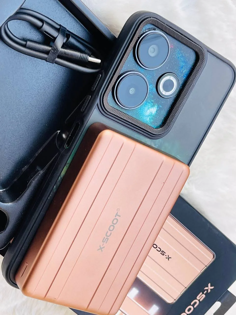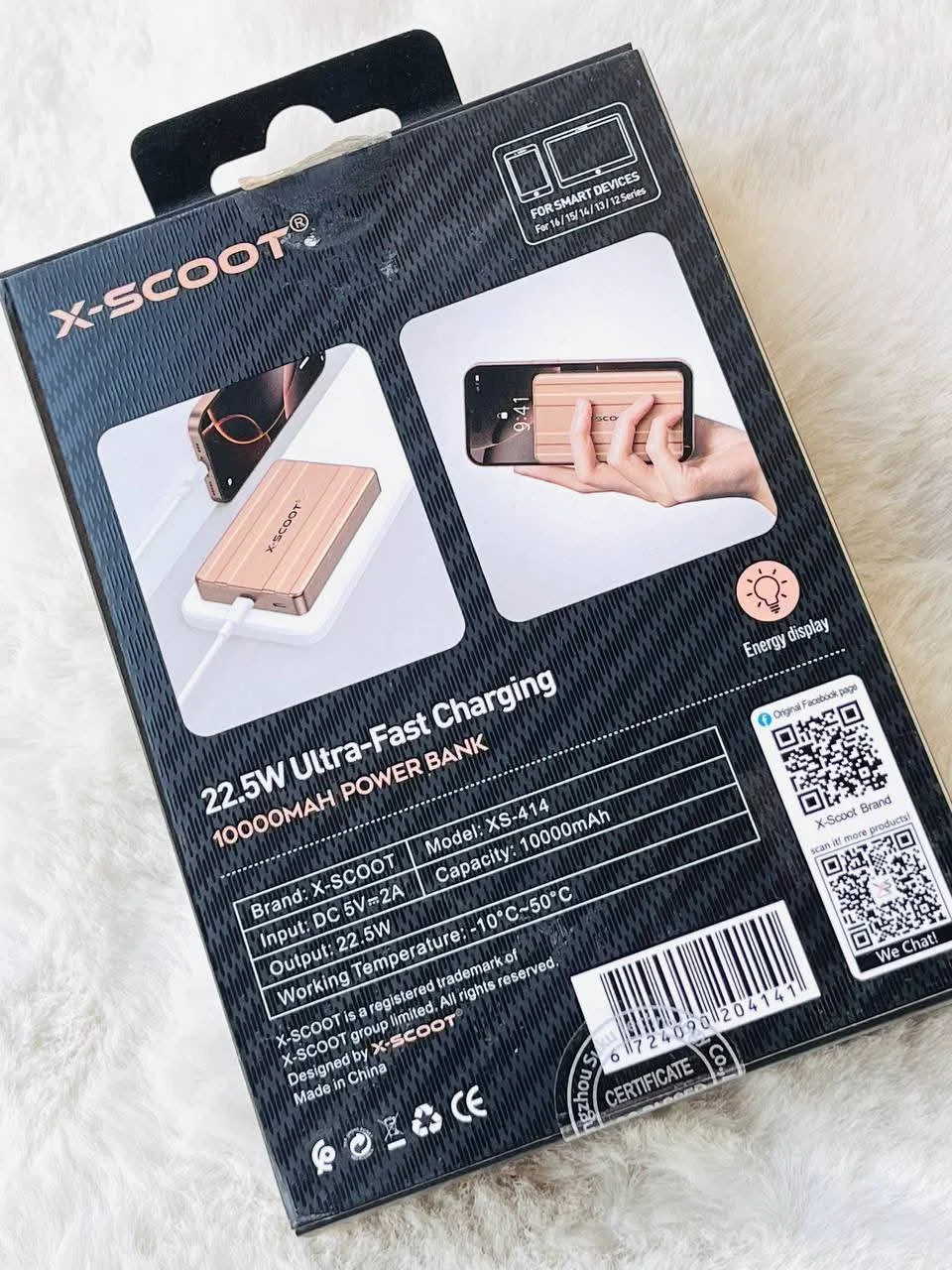 ودع فوضى الكابلات واستمتع بحرية الشحن مع باور بنك X-Scoot موديل XS-414. يجمع هذا الجهاز بين التصميم العصري الأنيق والقوة التقنية، ليكون رفيقك المثالي الذي يضمن بقاء أجهزتك مشحونة طوال اليوم، سواء كنت في العمل، السفر، أو التنزه.